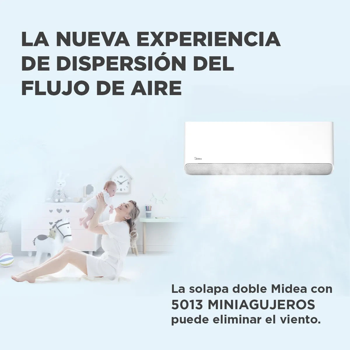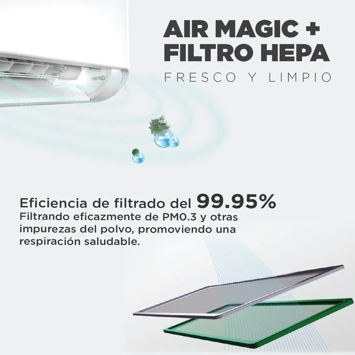 Este modelo se destaca por su tecnología de climatización sin brisa, lograda a través de su innovadora aleta frontal con miles de mini agujeros, que distribuyen el aire de forma suave y uniforme, asegurando un ambiente confortable sin corrientes de aire molestas.