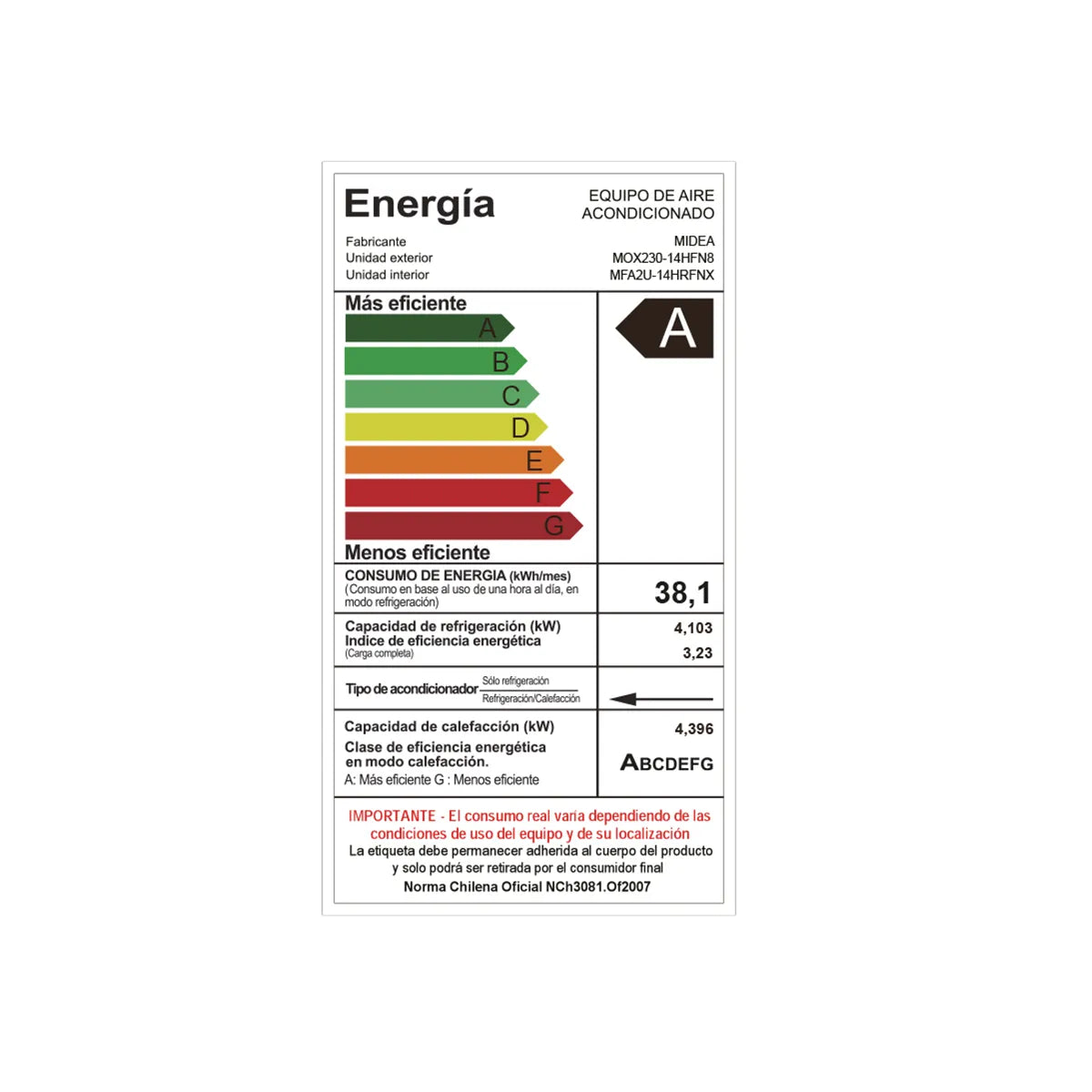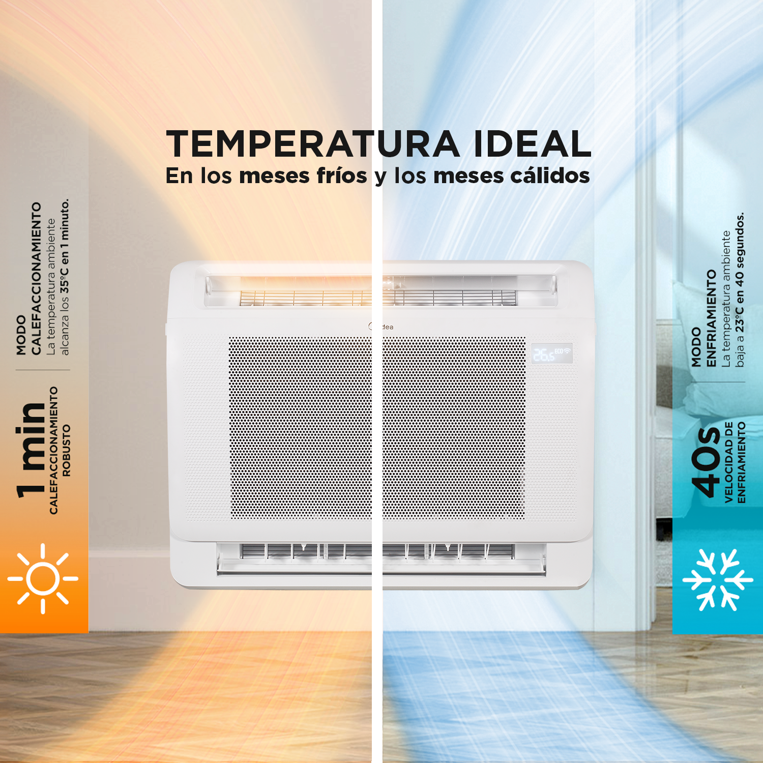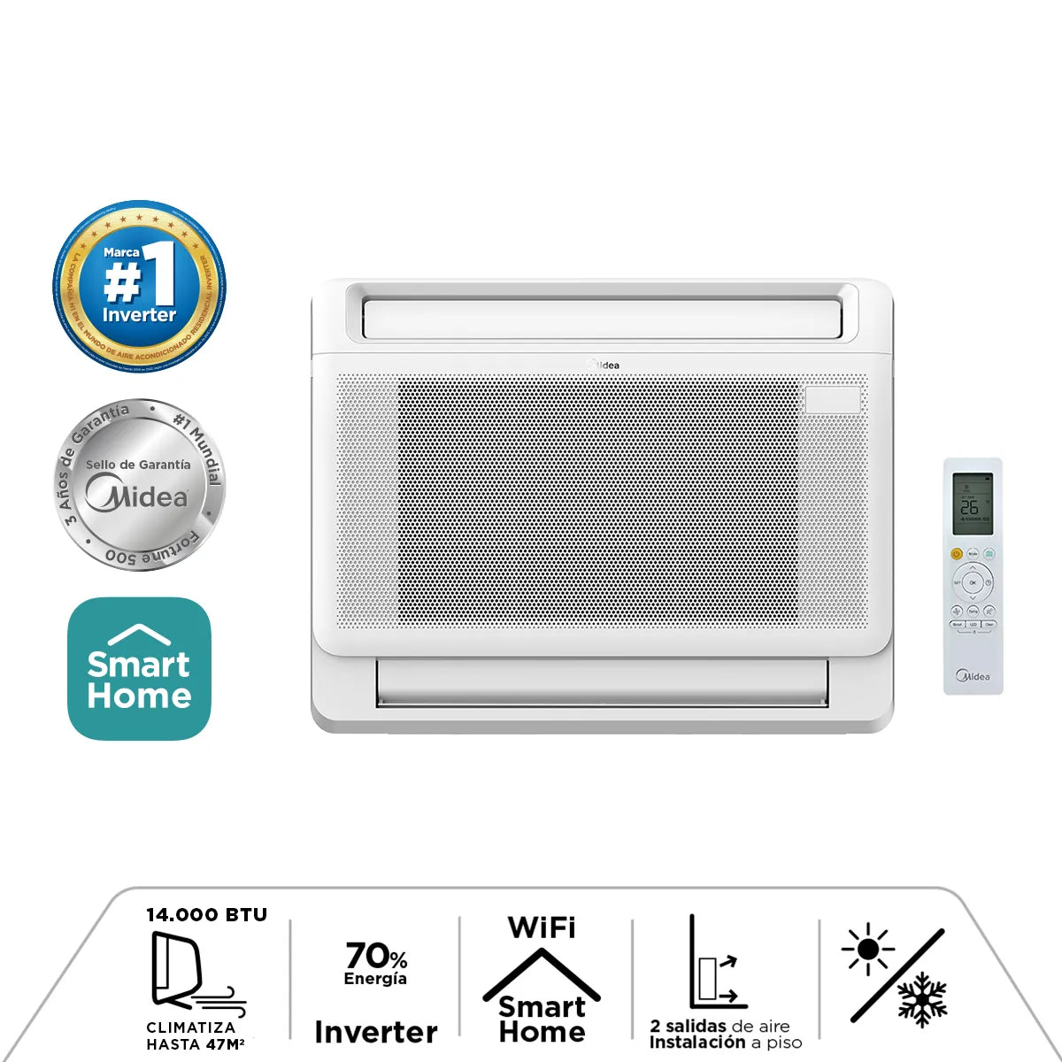 Disfruta de un ambiente perfecto todo el año con la MIDEA Consola Inverter HEAT de 14.000 BTU , diseñada para climatizar espacios de hasta 23m².