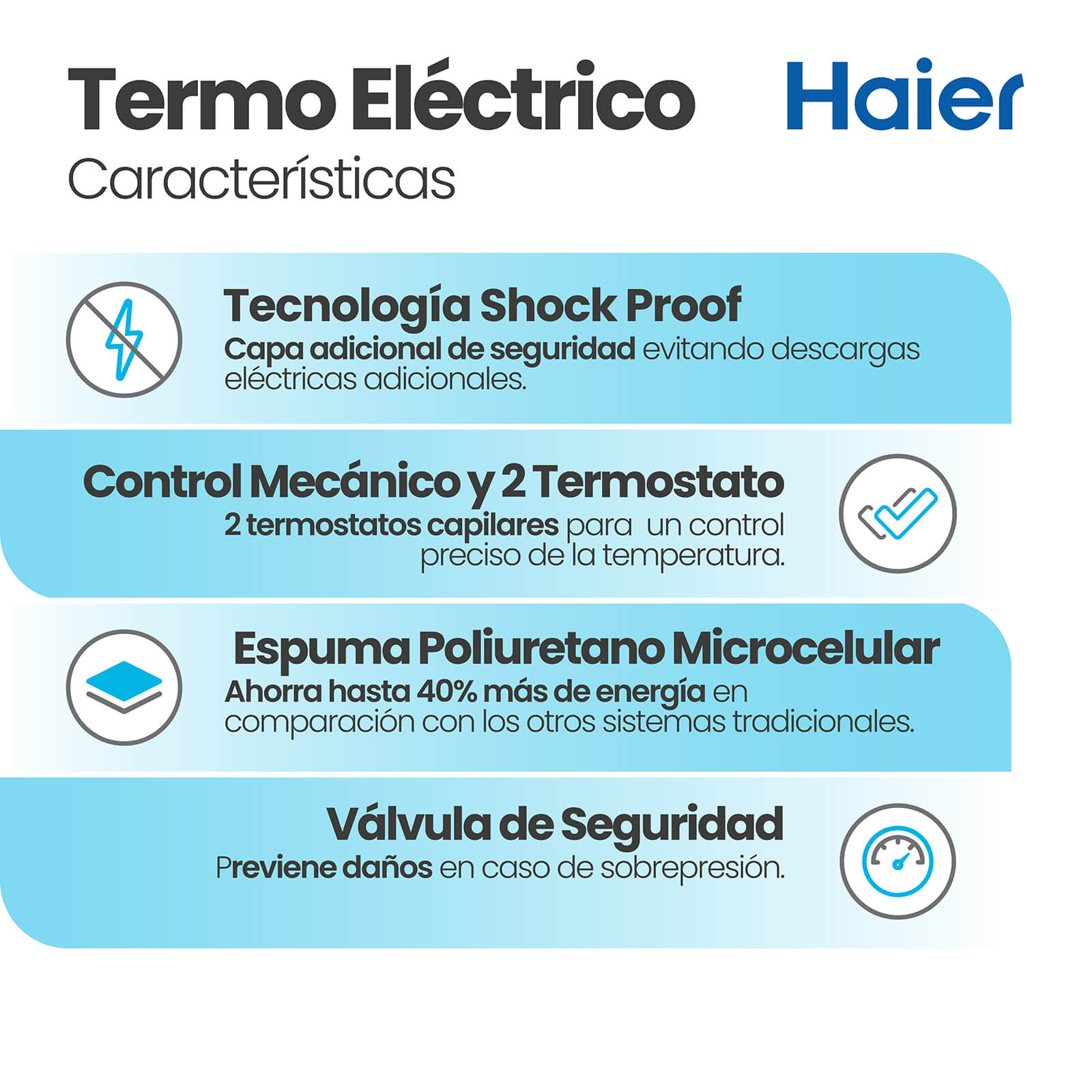 El termo eléctrico Haier es una solución compacta y versátil, perfecta para las necesidades diarias de agua caliente. Con una instalación sencilla y un cuerpo compacto, este  equipo generará agua caliente con las resistencias eléctricas más eficientes, por ende es la respuesta a la necesidad de un suministro de agua caliente de bajo costo inicial y fácil de instalar.
